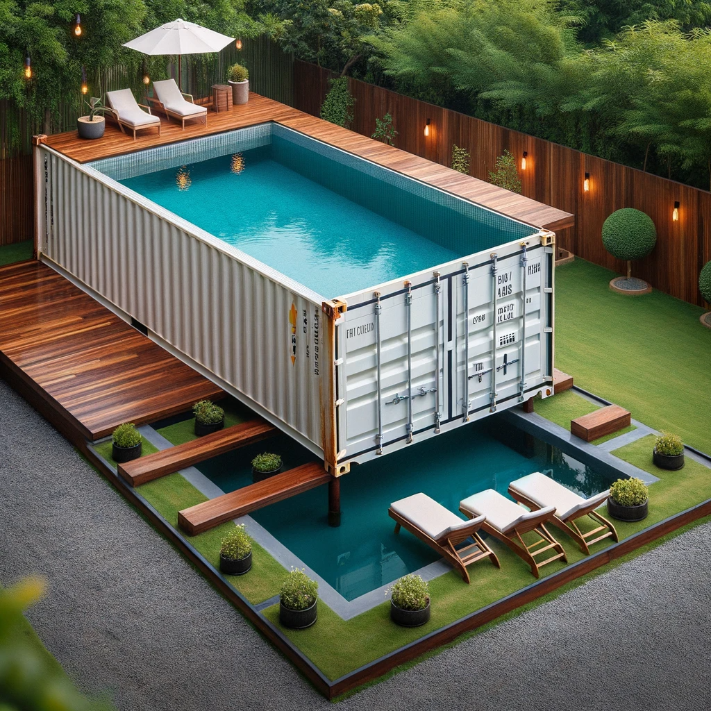 Above-ground swimming pools made from shipping containers are unique and cost-effective. They can feature clear water and be surrounded by a wooden deck with lounge chairs, creating a relaxing backyard oasis.