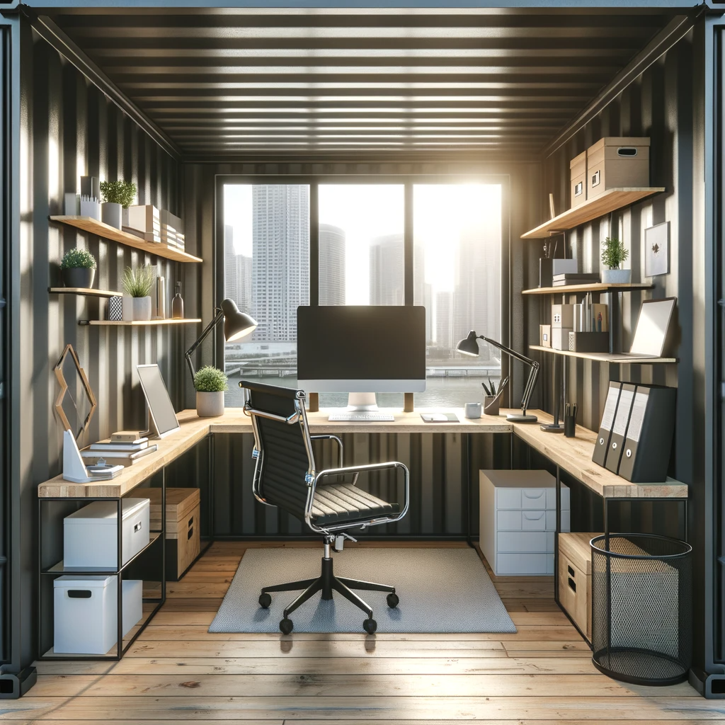 Shipping containers can be transformed into modern, efficient office spaces. With a neat workspace, desk, chair, computer, shelves, and large windows for natural light, they offer a compact and productive work environment.
