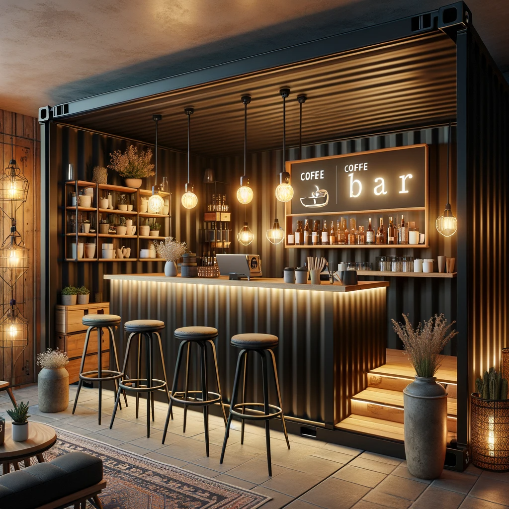 Create a chic and cozy bar or coffee shop inside a shipping container. The stylish counter, seating area, and warm ambiance with decorative lighting make it a unique spot for socializing.